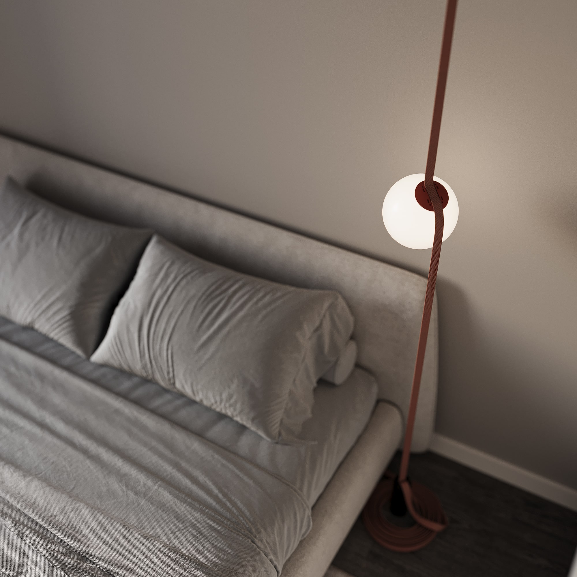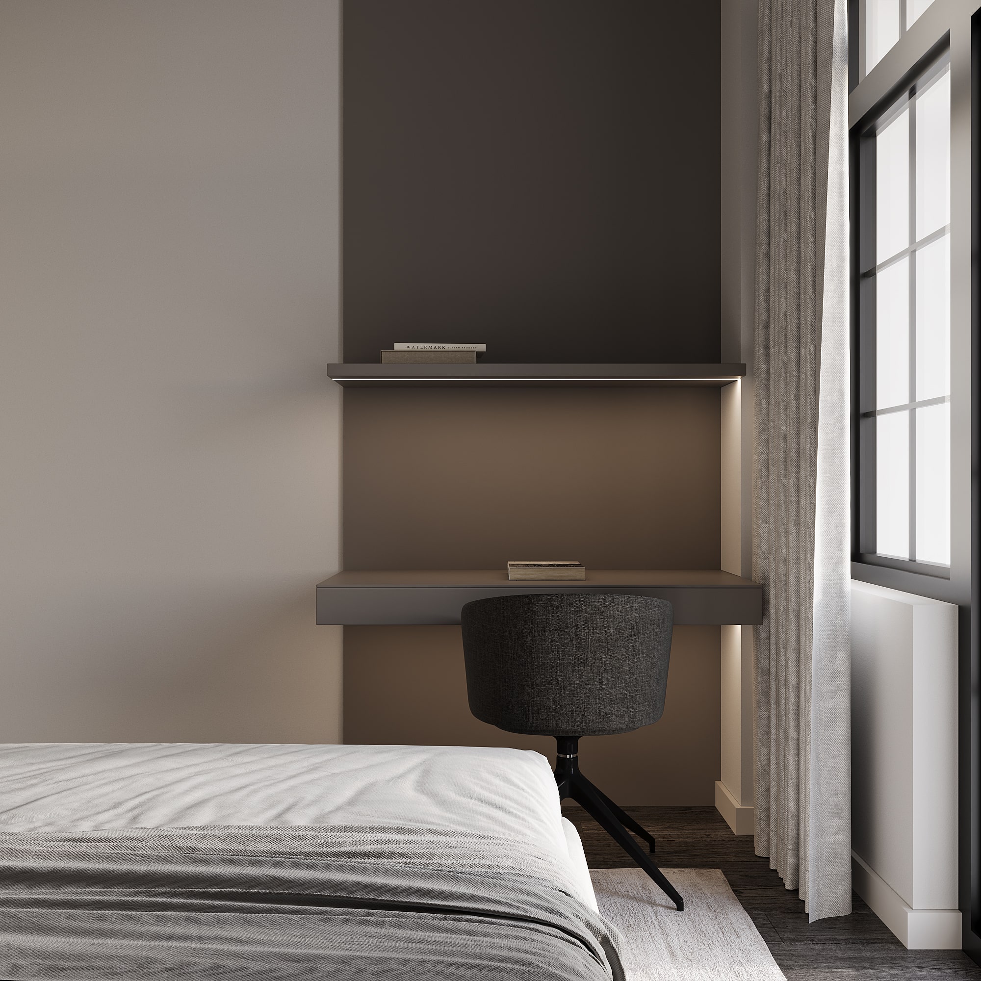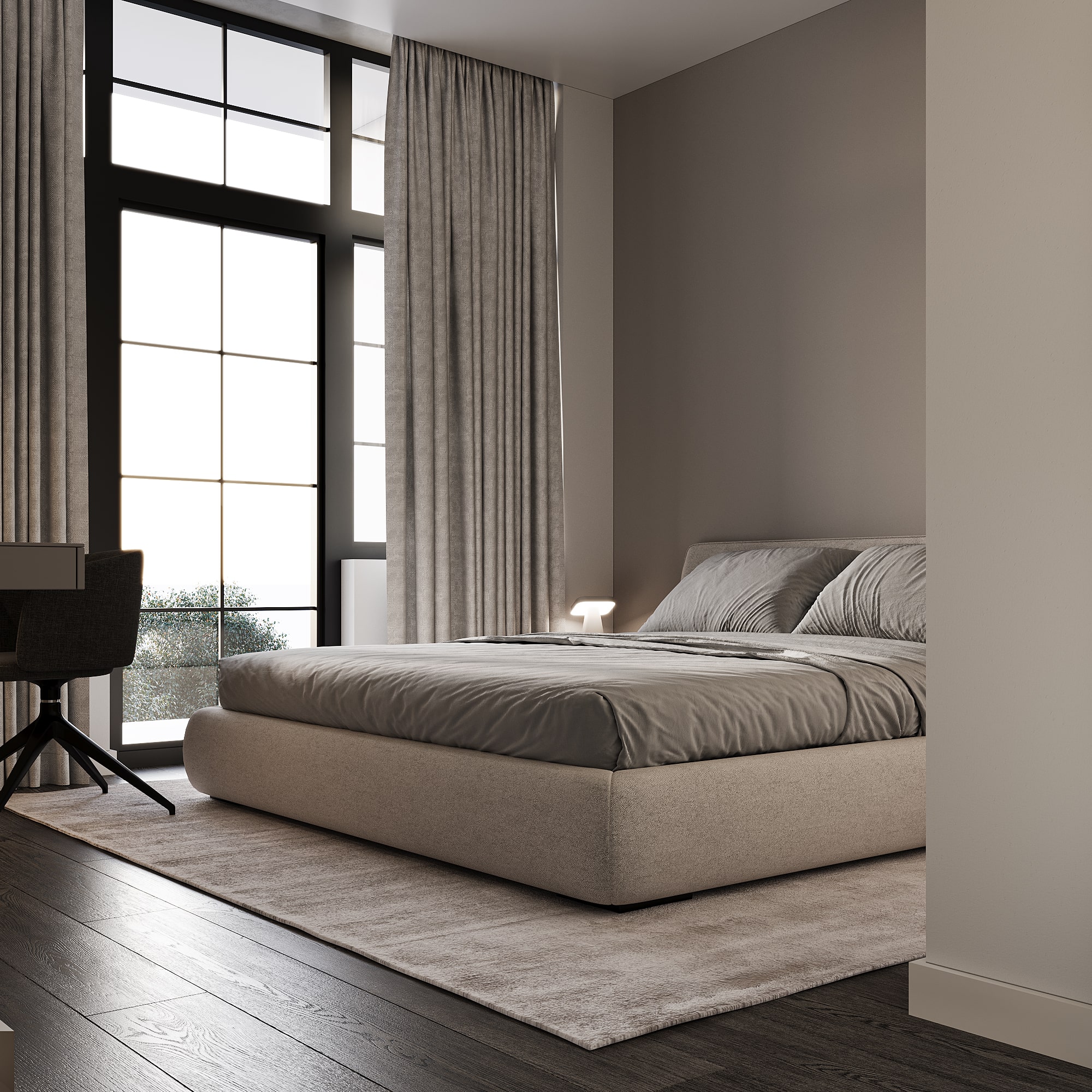 Ժամանակակից ննջարանի դիզայն, որը կենտրոնանում է նրբագեղ, թեթև և խաղաղ միջավայր ստեղծելու վրա: Այն ընդգրկում է բաց տարածքները՝ նվազագույն կահույքով, հաճախ նախընտրելով ցածր մահճակալներ և ներկառուցված պահեստավորման լուծումներ՝ խառնաշփոթից զերծ մթնոլորտ պահպանելու համար: Գունային պալիտրան հիմնականում պտտվում է չեզոք երանգների շուրջ։
